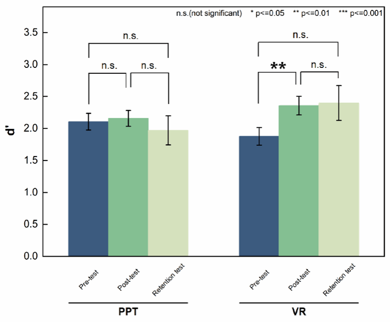 (1)行为层面:VR组在未受训场景中的危险识别敏感度(d’)显著提高,且这种效果在两周后依然保持,而PPT组则未能实现这种迁移。