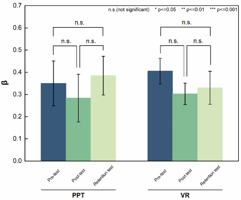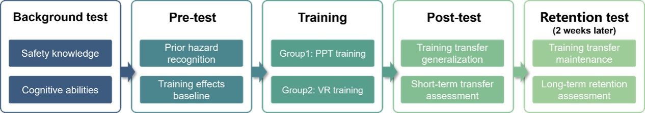 本研究采用“行为学+神经影像学”的综合方法。实验招募了16名无相关经验的参与者,随机分为VR组(体验式学习)和PPT组(传统的事故案例分析),实验流程包含背景测试、前测(Pre-test)、培训干预、后测(Post-test)以及两周后的保持测试(Retention test):