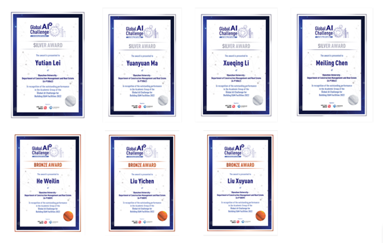 今年9月23日,由中国科协交流部、香港特别行政区创新及科技局指导,广东省科学技术协会、香港特别行政区机电工程署联合主办,面向全球参赛选手的首届“国际建筑机电人工智能大赛”(Global Building E&M AI Challenge)正式落下帷幕。中澳BIM与智慧建造联合研究中心来自范成课题组的2支队伍共7位学生突出重围分别斩获竞赛银奖和铜奖。银奖队伍(The AP-10062):雷宇田、马媛媛、陈美玲、李雪清;铜奖队伍((The AP-10059): 何炜麟、刘奕辰、刘旭媛)。也是该课题组继在2022年置慧杯获奖以来,在建筑机电领域再获专业认可!