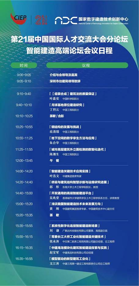 为促进智能建造领域核心共性技术、前沿引领技术和颠覆性技术的研发、转化和应用,由住建部科技委建筑产业转型升级专业委员会等单位指导,华中科技大学、深圳市住房和建设局、深圳大学等单位主办,国家数字建造技术创新中心、中建三局第一建设工程有限责任公司等单位承办的第21届中国国际人才交流大会分论坛——智能建造高端论坛将于4月16日在深圳会展中心桂花厅会议室召开。