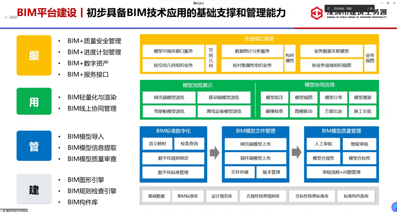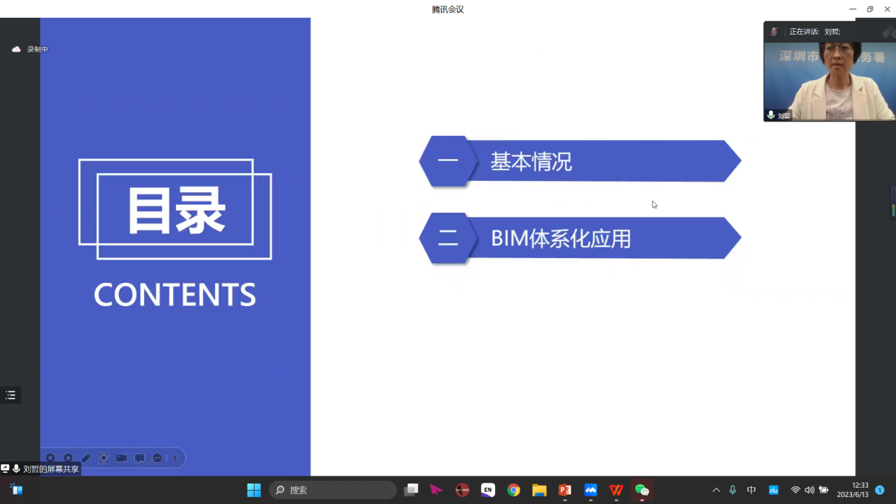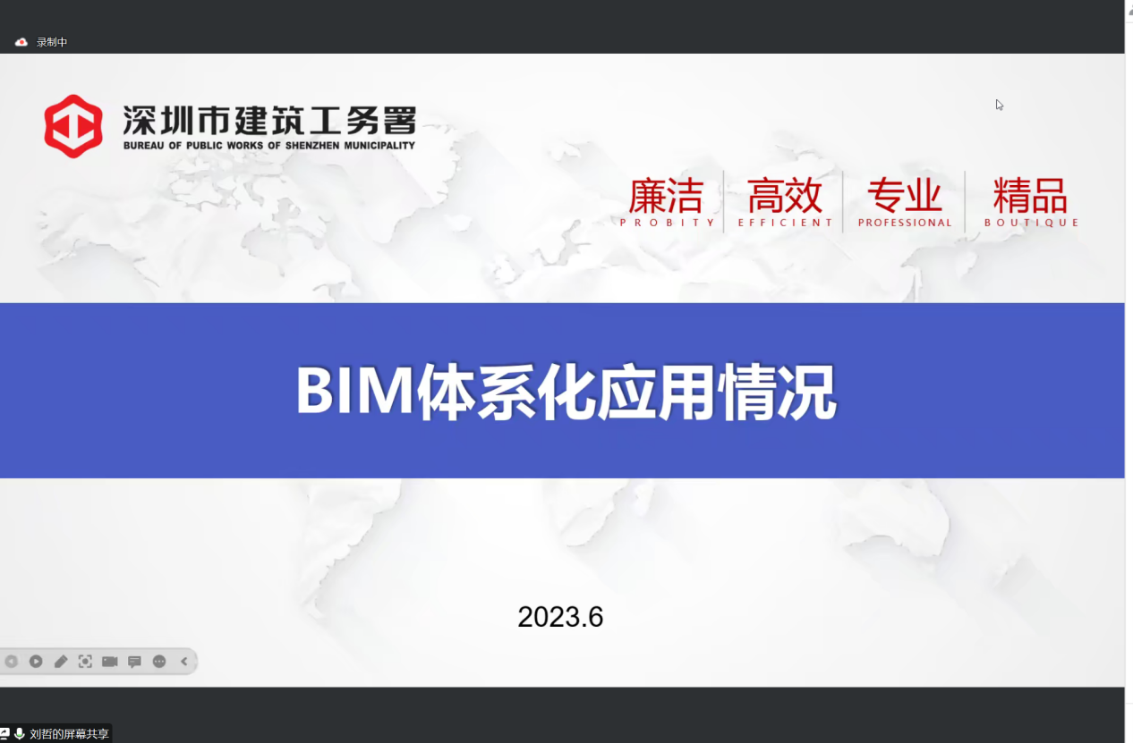 2023年6月13日中午,在工程管理研究生学术沙龙(2023年第6期)暨工程管理文化沙龙中,深圳市建筑工务署信息科技处刘哲处长(高级工程师、深圳市信息行业专家委员会专家)在线上(腾讯会议)为我中心作“BIM体系化应用情况”报告。主要内容包括:(1)基本情况:政府工程集中管理模式;工务署BIM应用总体路径;BIM实施理念;BIM应用场景等;(2)BIM平台建设:BIM模型应用流程;典型BIM应用案例项目解析;BIM技术应用的基础支撑和管理能力等。