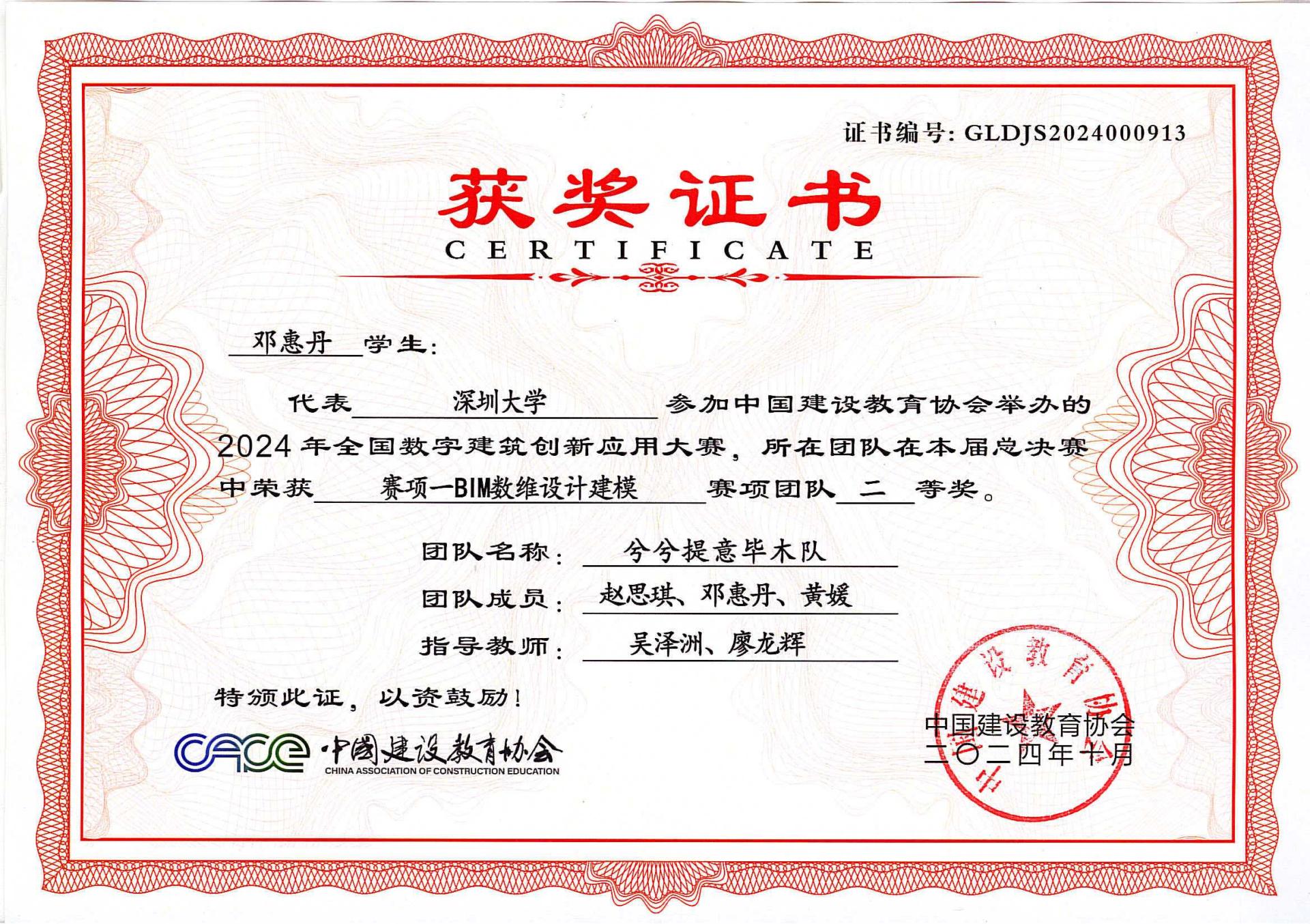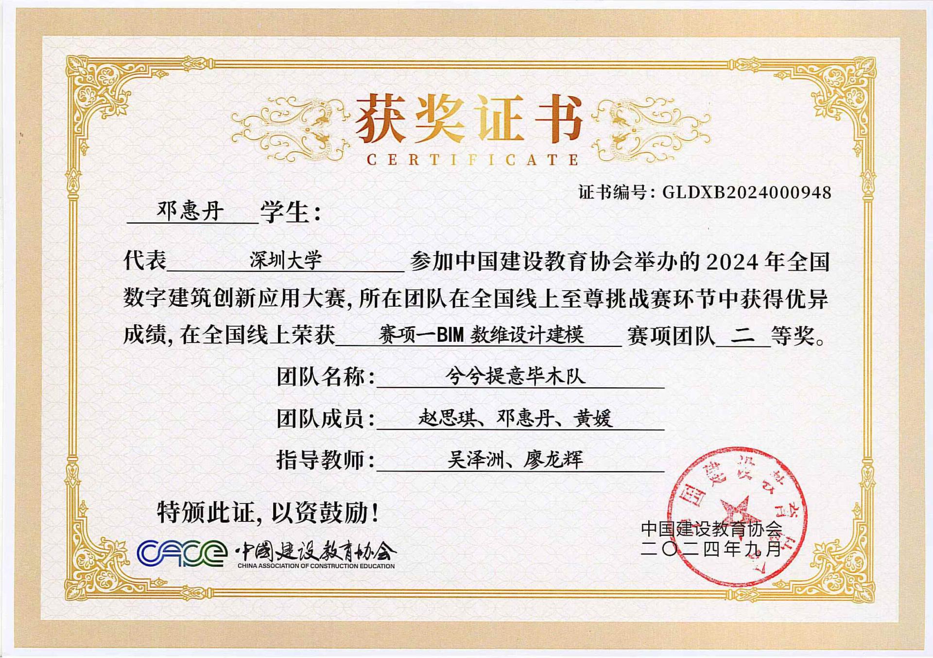 本次大赛包括线上挑战赛和全国总决赛两部分。我中心吴泽洲、廖龙辉老师指导2021级本科生邓惠丹、2022级本科生赵思琪、黄媛荣获BIM数维设计建模赛项线上挑战赛二等奖、全国总决赛二等奖。